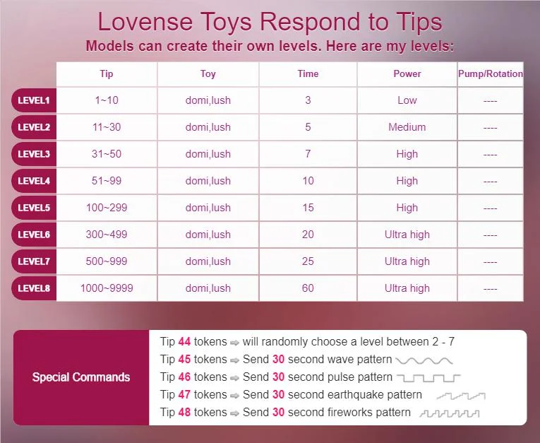 ช่วยตัวเอง, ดิลโด้หรือไวเบรเตอร์, ใช้กำปั้น, สูบบุหรี่, อาบน้ำ, ของเล่นสำหรับหัวนม, ท่าหมา, สอดใส่สองทาง, ฮาร์ดคอร์, เซ็กส์ทอย, ตีก้น, อาเฮะกาโอะ, โรลเพลย์, ถึงจุดสุดยอด, ดีปโทรต, โบลว์จ๊อบ, น้ำพุ่ง, เต้นยั่ว, คุยเรื่องลามก, ของเล่นแอนัล, นอกสถานที่, ทำอาหาร, ใช้นิ้ว, เฟติชเท้า, ทำให้สำลัก, โชว์น้ำมัน, ส้นสูง, เปลือยอก, ทเวิร์ก, แอนัล, วับๆ แวมๆ, โยคะ, ทำให้อับอาย