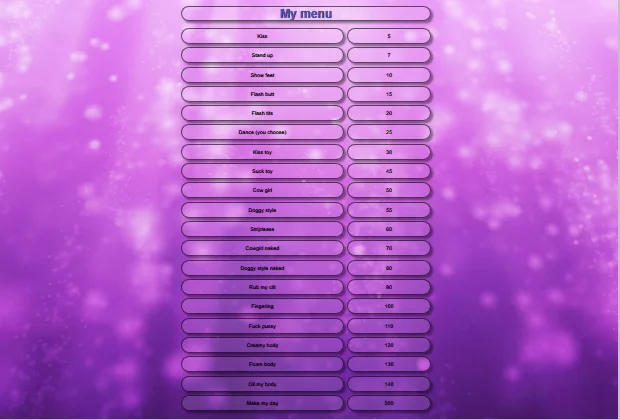 ท่าหมา, เต้นยั่ว, ร่องอูฐ, ใช้นิ้ว, ดิลโด้หรือไวเบรเตอร์, คุยเรื่องลามก, ระบำเปลื้องผ้า, เซ็กส์ทอย, โบลว์จ๊อบ, ช่วยตัวเอง, ทเวิร์ก, อาเฮะกาโอะ, ตีก้น, เฟติชเท้า, นวด, ใช้หน้าอก, ถึงจุดสุดยอด, ใช้มือ, ดีปโทรต, โรลเพลย์, เล้าโลมด้วยเท้า, เปลือยอก, การให้คะแนนเจ้าโลก, ฮาร์ดคอร์, แนะนำการช่วยตัวเอง, แลกเปลี่ยนคู่กัน, โชว์น้ำมัน, อาบน้ำ
